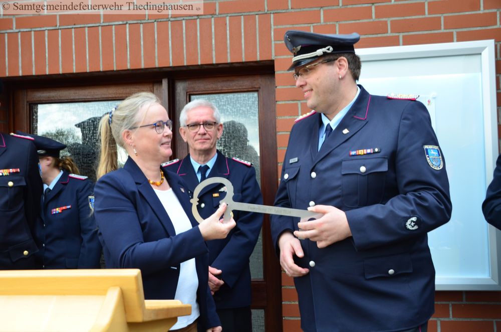 Bürgermeisterin Anke Fahrenholz und Martin Köster halten den symbolischen Schlüssel für das Kinder- und Jugendfeuerwehrhaus in Beppen in den Händen.                                       Foto: Michael Galian