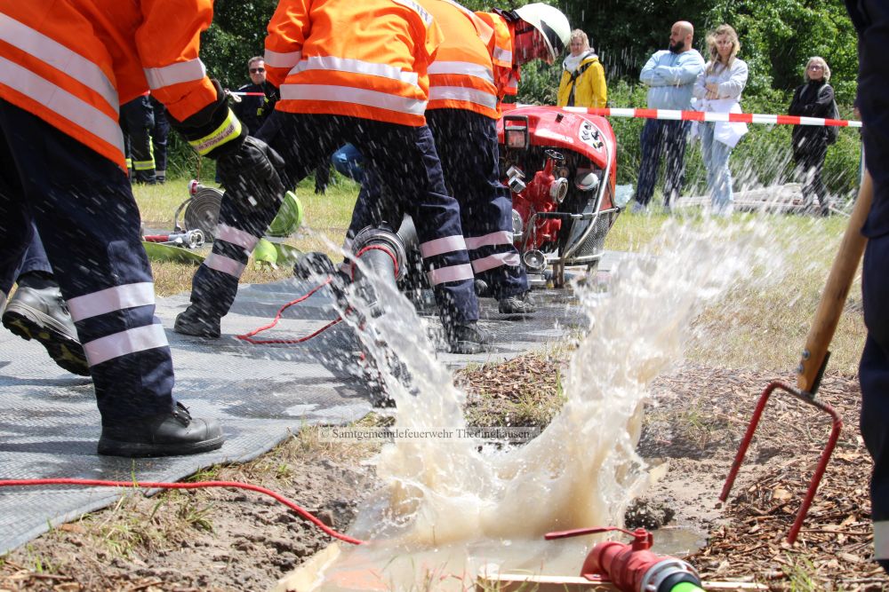 Die am Ende siegreichen Thedinghäuser lassen den Saugschlauch zu Wasser. Foto: Albrecht