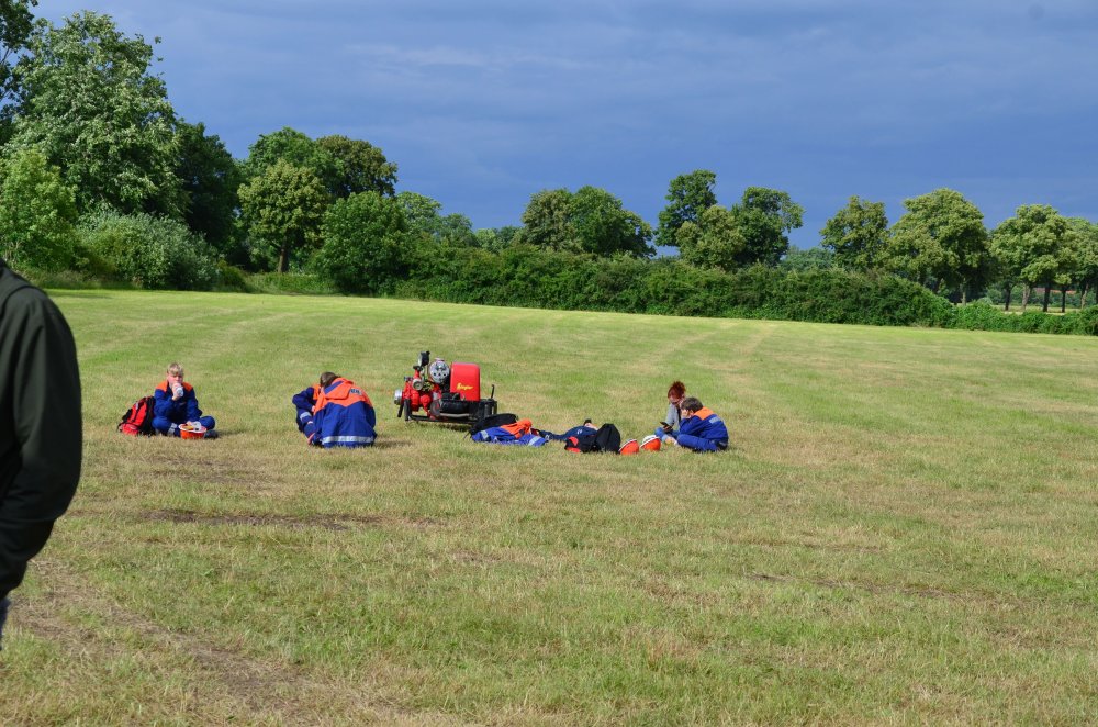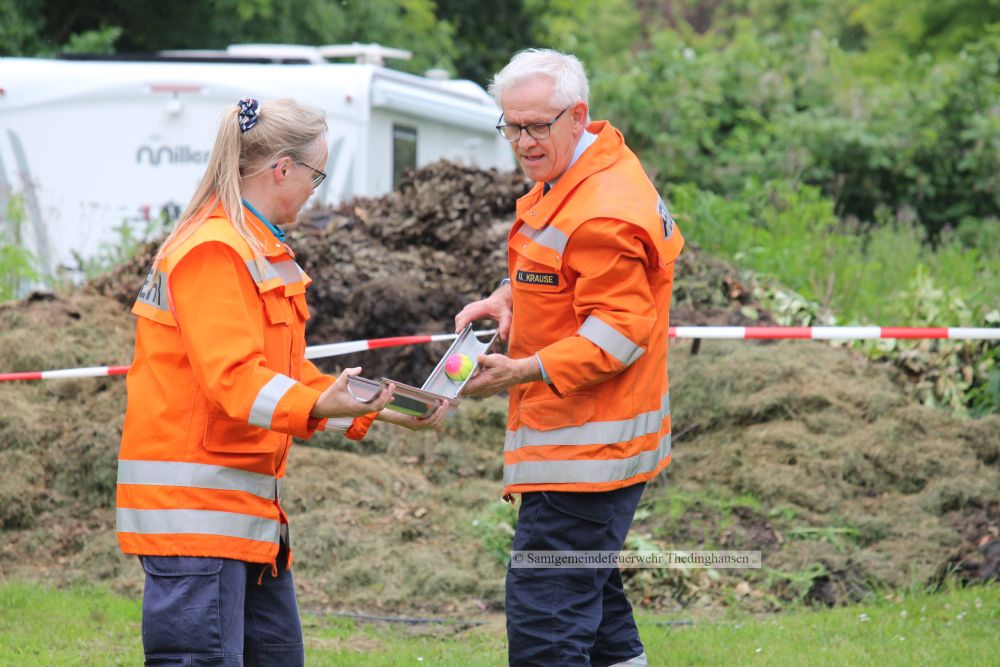 Kurz nach Mittag wurde es dann ernst. Die Wettkampfgruppen trafen im Minutentakt auf dem Gelände am Erbhof ein und absolvierten unter den kritischen Augen der Richter ihre Übung, die einen Realeinsatz simulierte. Auf punktgenaue vorgegebene Zeittakte wurde geachtet, bis auch der letzte Kanister vom Podest gespritzt war und die Zeit gestoppt wurde. Die jeweiligen Gruppenführer mussten danach noch einige Theoriefragen beantworten.