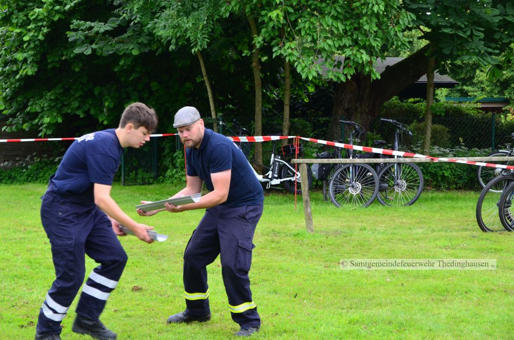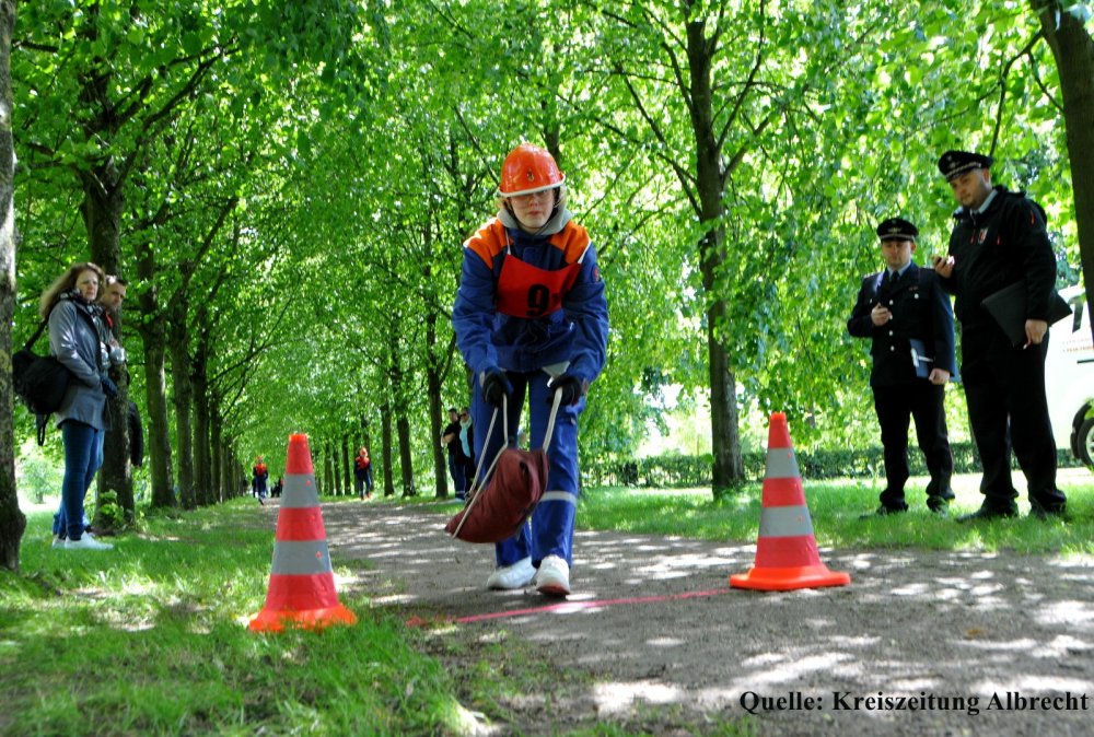 Der Nachwuchs zeigte sein Können beim Bundeswettbewerb der Deutschen Jugendfeuerwehr, welcher den feuerwehrtechnischen Anteil in der Nachwuchsarbeit betonen soll. „Er soll weder die Vorbereitung auf die Einsatzabteilungen der Freiwilligen Feuerwehren noch einsatztaktische Vorbereitung auf den Einsatzdienst sein. Er ist als reiner Wettbewerb im Rahmen der feuerwehrtechnischen Ausbildung innerhalb der Jugendfeuerwehr zu sehen“, erklärte der Gemeindejugendfeuerwehrwart Udo Krause den Jugendwettbewerb, der in zwei Teile gegliedert ist und von den fünf Jugendfeuerwehren im Rahmen des Samtgemeindefeuerwehrtages in Thedinghausen absolviert wurde. Der sogenannte B-Teil als Hindernislauf mit geforderten Aufgaben wie etwa dem doppelten Ankerknoten am Strahlrohr fand in der Jahrtausendallee des Baumparks am Schloss Erbhof statt und der A-Teil, ein simulierter Löschangriff, bei den „Großen“ auf der Erbhofwiese am Ortseingang von Thedinghausen. Am Ende siegte die Jugendfeuerwehr aus Morsum.